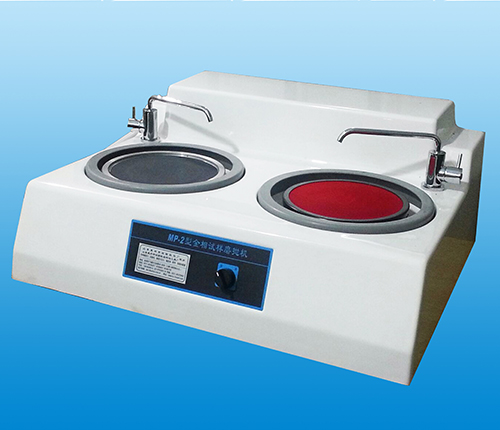 该机左盘为预磨盘,右盘为抛光盘。预磨时,通过回转水咀将冷却水不断注入旋转的磨盘中,砂纸在大气压的作用下可以紧贴在磨盘上,从而不须将砂纸粘结或夹紧。抛光时,可将抛光织物平铺在抛光盘上,然后用扣圈扣紧织物,再进行抛光,织物和抛光盘都可及时方便的更换。